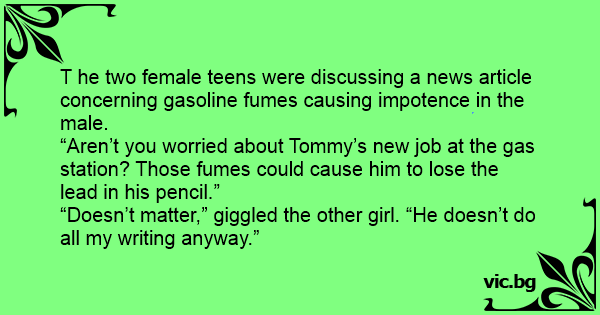 T he two female teens were discussing a news article concerning gasoline fumes causing impotence in the male.