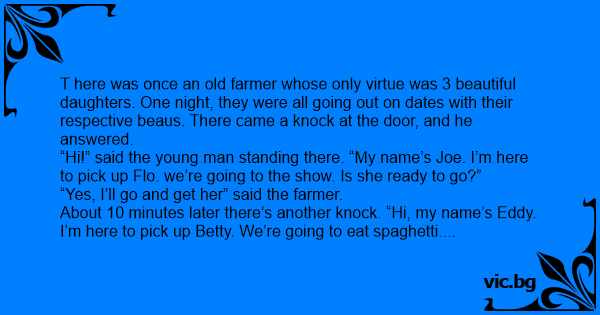 T here was once an old farmer whose only virtue was 3 beautiful daughters. One night, they were all going out on dates with their respective beaus. There came a knock at the door, and he answered.