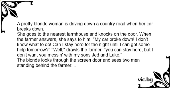 She goes to the nearest farmhouse and knocks on the door. When the farmer answers, she says to him, ''My car broke down! I don't know what to do! Can I stay here for the night until I can get some help tomorrow?'' ''Well,'' drawls the farmer, ''you can stay here, but I don't want you messin' with my sons Jed and Luke.''
