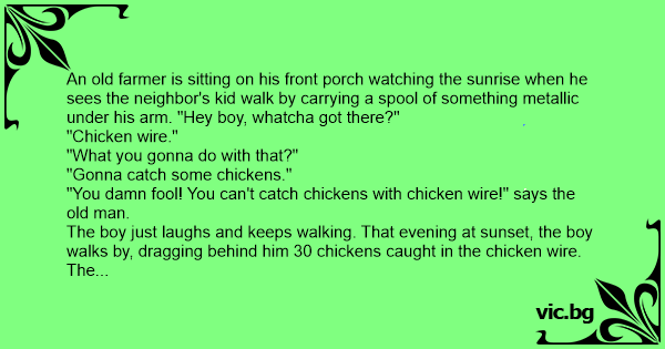 The boy just laughs and keeps walking. That evening at sunset, the boy walks by, dragging behind him 30 chickens caught in the chicken wire.