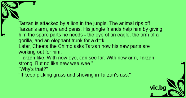 Tarzan havde engang mistet en arm et øje og sin penis. Derfor gik han til doktoren og spurgte hvad han skulle gøre. Så gav doktoren ham bare en abe arm et ørne øje og et elefant snabel. 2 uger...