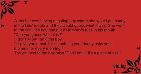 A teacher was having a tasting day where she would put candy in the kids' mouth and they would guess what it was. She went to the first little boy and put a Hershey's Kiss in his mouth.