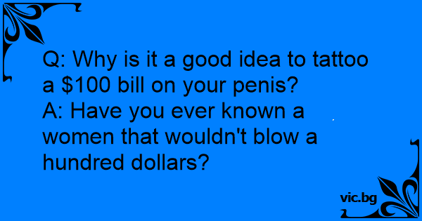 3 reasons why you should get a $100 bill tattooed onto your salami. 1. You can play with your money. 2. You can watch your money grow. 3. Every woman loves to blow money.