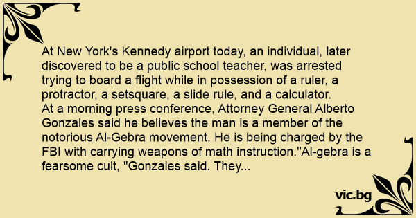 At a morning press conference, Attorney General Alberto Gonzales said he believes the man is a member of the notorious Al-Gebra movement. He is being charged by the FBI with carrying weapons of math instruction."Al-gebra is a fearsome cult, "Gonzales said. They desire average solutions by means and extremes, and sometimes go off on tangents in a search of absolute value. They use secret code names like 'x' and 'y' and refer to themselves as unknowns, but we have determined they belong to a common denominator of the axis of medieval with coordinates in every country. As the Greek philanderer Isosceles used to say, "There are 3 sides to every triangle."When asked to comment on the arrest, President Bush said, "If God had wanted us to have better weapons of math instruction, He would have given us more fingers and toes."