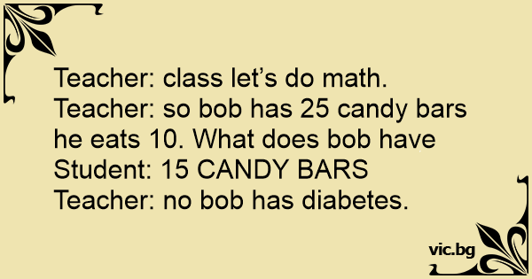 Teacher: class let’s do math.<br />Teacher: so bob has 25 candy bars he eats 10. What does bob have<br />Student: 15 CANDY BARS<br />Teacher: no bob has diabetes.