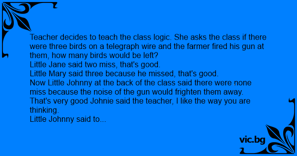 Teacher decides to teach the class logic. She asks the class if there were three birds on a telegraph wire and the farmer fired his gun at them, how many birds would be left?