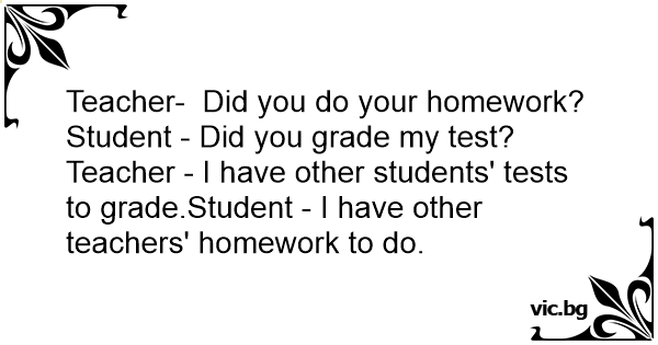 Teacher- Did you do your homework?<br />Student - Did you grade my test?Teacher - I have other students' tests to grade.Student - I have other teachers' homework to do.
