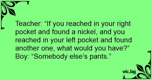 - Иванчо, колко прави 10+5? - Не си спомням. - Добре, ако имаш в единия джоб 10 лв., а в другия 5 лв., значи ... - ... Значи съм обул чужди панталони ...