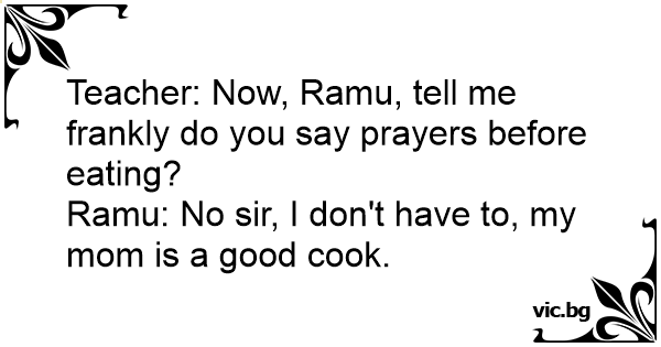 Kees tegen Jantje: "Moeten jullie ook altijd bidden voor het eten?"Jantje: "Nee, mijn moeder kan goed koken."