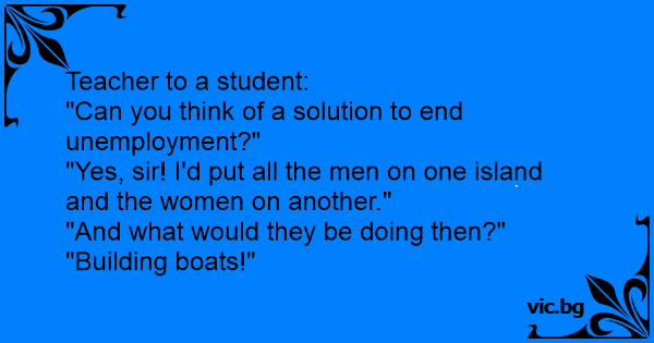 Teacher to a student: "Can you think of a solution to end unemployment?" "Yes, sir! I'd put all the men on one island and the women on another." "And what would they be doing then?" "Building boats!"