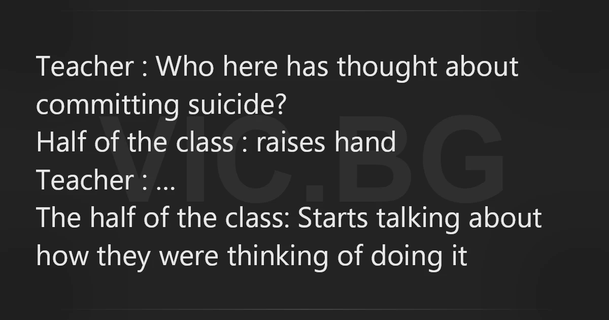 Teacher : Who here has thought about committing suicide? Half of the class : raises hand Teacher : … The half of the class: Starts talking about how they were thinking of doing it