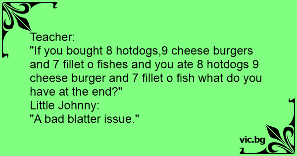 "If you bought 8 hotdogs,9 cheese burgers and 7 fillet o fishes and you ate 8 hotdogs 9 cheese burger and 7 fillet o fish what do you have at the end?"