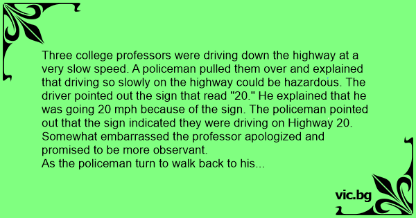 Полицай спира на магистралата една стара дама, която кара с 25 км/ч. Дамата пита: - Защо ме спряхте, аз спазвам ограничението. Ето, на табелата пише А 25 и аз карам с 25 км/ч. - Но, госпожо, това е номер на магистралата, а не ограничение на скоростта. Добре, тръгвайте, но виждам, че спътничката...