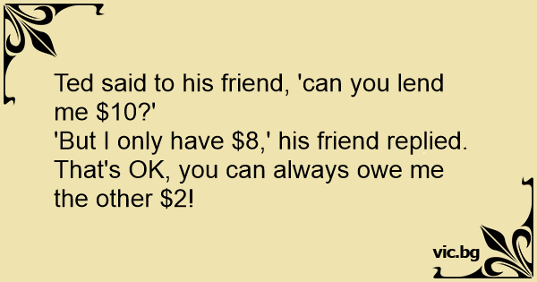 Син на банкер каза на баща си: - Тате, заеми ми 20 евро, но ми дай само 10. - Защо, момчето ми? - Така ще ми дължиш 10 евро, аз ще ти дължа 10 евро и ще сме на чисто