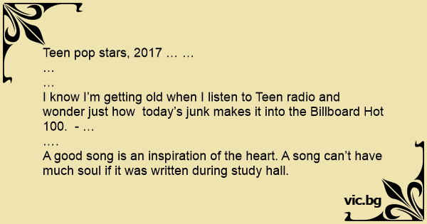I know I’m getting old when I listen to Teen radio and wonder just how today’s junk makes it into the Billboard Hot 100. - …