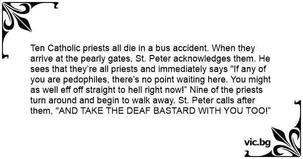 Ten Catholic priests all die in a bus accident. When they arrive at the pearly gates, St. Peter acknowledges them. He sees that they’re all priests and immediately says "If any of you are pedophiles, there’s no point waiting here. You might as well eff off straight to hеll right now!” Nine of the priests turn around and begin to walk away. St. Peter calls after them, "AND TAKE THE DEAF ВАSТАRD WITH YOU TOO!”