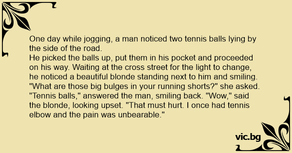 He picked the ваlls up, put them in his pocket and proceeded on his way. Waiting at the cross street for the light to change, he noticed a beautiful blonde standing next to him and smiling. "What are those big bulges in your running shorts?" she asked. "Tennis ваlls," answered the man, smiling back. "Wow," said the blonde, looking upset. "That must hurt. I once had tennis elbow and the pain was unbearable."