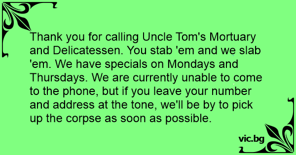 Thank you for calling Uncle Tom's Mortuary and Delicatessen. You stab 'em and we slab 'em. We have specials on Mondays and Thursdays. We are currently unable to come to the phone, but if you leave your number and address at the tone, we'll be by to pick up the corpse as soon as possible.