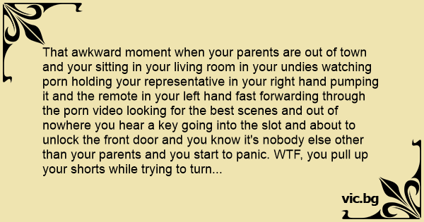 That awkward moment when your parents are out of town and your sitting in your living room in your undiеs watching роrn holding your representative in your right hand pumping it and the remote in your left hand fast forwarding through the роrn video looking for the best scenes and out of nowhere you hear a key going into the slot and about to unlock the front door and you know it's nobody else other than your parents and you start to panic. WТF, you pull up your shorts while trying to turn off the DVD player and the TV and make a dash to the bathroom or your room before the door swings open and your parents catch you. How often did you forget to do one thing during that panic, you might of turned off the TV but not the DVD so if anyone turns on the TV they will see what you were watching etc... etc....