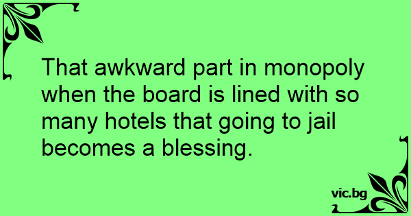 That awkward part in monopoly when the board is lined with so many hotels that going to jail becomes a blessing.
