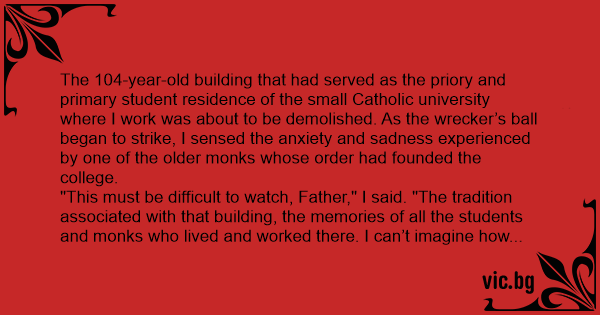 The 104-year-old building that had served as the priory and primary student residence of the small Catholic university where I work was about to be demolished. As the wrecker’s ball began to strike, I sensed the anxiety and sadness experienced by one of the older monks whose order had founded the college.