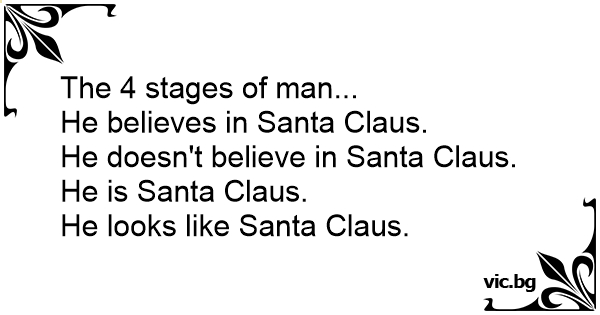 Живота на всеки мъж протича на три етапа: 1. Вярваш в Дядо Коледа. 2. Не вярваш в Дядо Коледа. 3. Ти си Дядо Коледа.