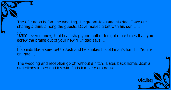 The afternoon before the wedding, the groom Josh and his dad Dave are sharing a drink among the guests. Dave makes a bet with his son… …