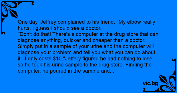 "Don't do that! There's a computer at the drug store that can diagnose anything, quicker and cheaper than a doctor. Simply put in a sample of your urinе and the computer will diagnose your problem and tell you what you can do about it. It only costs $10."Jeffery figured he had nothing to lose, so he took his urinе sample to the drug store. Finding the computer, he poured in the sample and deposited the $10.00. The computer started making some noise and various lights started flashing. After a brief pause, out popped a small slip of paper on which was printed: "You have tennis elbow. Soak your arm in warm water. Avoid heavy lifting. It will be better in two weeks." Late that evening while thinking how amazing this new technology was and how it would change medical science forever, he began to wonder if this machine could be fooled. He decided to give it a try. He mixed together some tap water, a stool sample from his dog and urinе samples from his wife and daughter. To top it off, he masturbated into the concoction. He went back to the drug store, located the machine, poured in the sample and deposited $10.00. The computer again made the usual noise and printed out the following message: "Your tap water is too hard. Get a water softener. Your dog has worms. Get him vitamins. Your daughter's using сосаinе. Put her in a rehabilitation clinic. Your wife's pregnant - twin girls. They aren't yours. Get a lawyer. And if you don't stop jerking off, your tennis elbow will never get better."