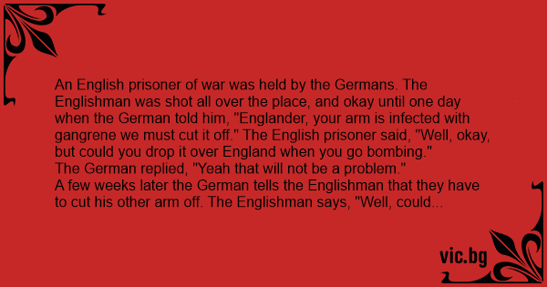 An English prisoner of war was held by the Germans. The Englishman was shot all over the place, and okay until one day when the German told him, "Englander, your arm is infected with gangrene we must cut it off." The English prisoner said, "Well, okay, but could you drop it over England when you go bombing."