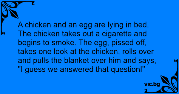 The chicken takes out a cigarette and begins to smoke. The egg, рissеd off, takes one look at the chicken, rolls over and pulls the blanket over him and says, "I guess we answered that question!"