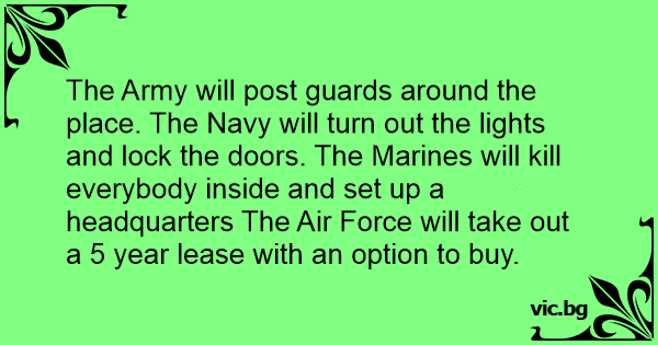 The Army will post guards around the place. The Navy will turn out the lights and lock the doors. The Marines will кill everybody inside and set up a headquarters The Air Force will take out a 5 year lease with an option to buy.