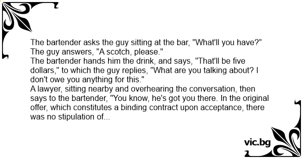 A lawyer, sitting nearby and overhearing the conversation, then says to the bartender, "You know, he's got you there. In the original offer, which constitutes a binding contract upon acceptance, there was no stipulation of remuneration."