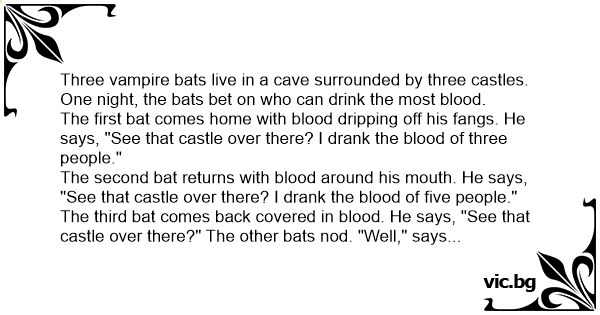 The first bat comes home with blood dripping off his fangs. He says, "See that castle over there? I drank the blood of three people."