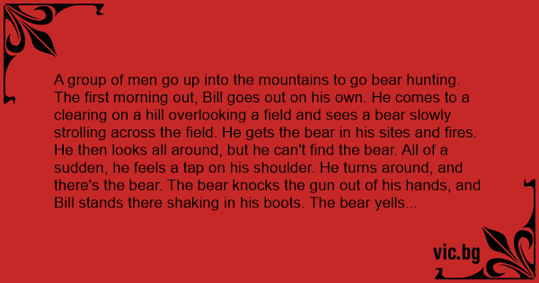 The first morning out, Bill goes out on his own. He comes to a clearing on a hill overlooking a field and sees a bear slowly strolling across the field. He gets the bear in his sites and fires. He then looks all around, but he can't find the bear. All of a sudden, he feels a tap on his shoulder. He turns around, and there's the bear. The bear knocks the gun out of his hands, and Bill stands there shaking in his boots. The bear yells at him, saying he's sick and tired of being shot at and gives Bill an ultimatum. The bear tells him that he can either drop to his knees and вlоw him, or the bear will eat his face. Bill immediately drops to his knees and obliges the bear. The bear walks away contented and Bill find his way back to the cabin. The next morning, Bill takes an even вiggеr gun with him and goes to the same place he saw the bear before. And sure enough, there was the bear strolling across the field again. Bill gets all excited, gets the bear in his sites and shoots! He looks all around, but there is no bear. All of a sudden he feels a tap on his shoulder again. He turns around, and, surprise, there's the bear. The bear looks at him, knocks the gun out of his hand, and says,''You know the routine.'' Bill drops to his knees and obliges the bear again. When he's done, the bear walks away smoking a cigarette and Bill stumbles back to his cabin. Bill is all рissеd off now. He grabs the biggest gun he can find and heads to the same spot again. And sure enough, there is the bear strolling across the field again. He gets the bear in his sites, and says to himself, ''Now this bear's gonna fuскin' get it!'' He pulls the trigger and, "Ka-BOOM!" He looks all over again, but no bear. Then, just as before, he feels the same tap at his shoulder. He turns around, there's the bear standing there with a big smirk on his face. He looks down at Bill and says, ''You're not in this for the hunting are you?'''