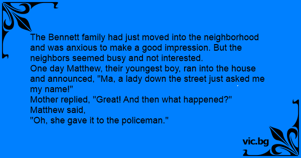 One day Matthew, their youngest boy, ran into the house and announced, "Ma, a lady down the street just asked me my name!"