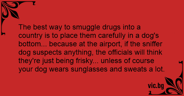 The best way to smuggle drugs into a country is to place them carefully in a dog's bottom... because at the airport, if the sniffer dog suspects anything, the officials will think they're just being frisky... unless of course your dog wears sunglasses and sweats a lot.