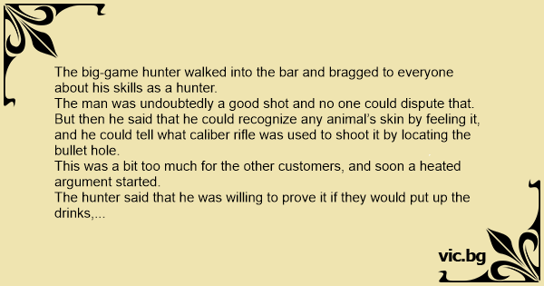 The big-game hunter walked into the bar and bragged to everyone about his skills as a hunter.