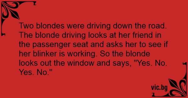 A husband is driving with her blonde wife, the husband says "Can you stick your head out the window if the blinker works?" T hen the blonde sticks her head out the window and replies, "Yes, No,...