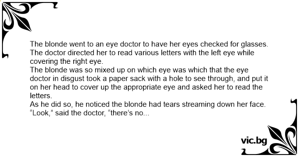 The blonde was so mixed up on which eye was which that the eye doctor in disgust took a paper sack with a hole to see through, and put it on her head to cover up the appropriate eye and asked her to read the letters.