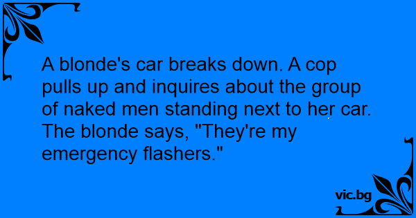 A blonde's car breaks down. A cop pulls up and inquires about the group of nакеd men standing next to her car.