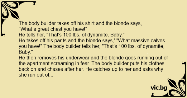 He takes off his pants and the blonde says,' "What massive calves you have!" The body builder tells her, "That's 100 lbs. of dynamite, Baby."