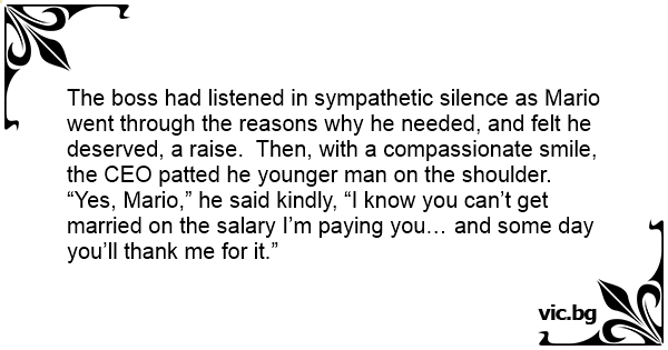 The boss had listened in sympathetic silence as Mario went through the reasons why he needed, and felt he deserved, a raise. Then, with a compassionate smile, the CEO patted he younger man on the shoulder. “Yes, Mario,” he said kindly, “I know you can’t get married on the salary I’m paying you… and some day you’ll thank me for it.”
