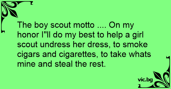 The boy scout motto .... On my honor I"ll do my best to help a girl scout undress her dress, to smoke cigars and cigarettes, to take whats mine and steal the rest.