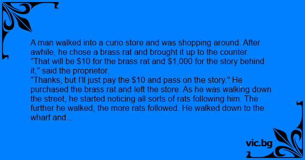"Thanks, but I'll just pay the $10 and pass on the story." He purchased the brass rat and left the store. As he was walking down the street, he started noticing all sorts of rats following him. The further he walked, the more rats followed. He walked down to the wharf and still more rats came out and followed him. So, he decided to walk out into the water, all the rats drowned. He returned to the store shortly.