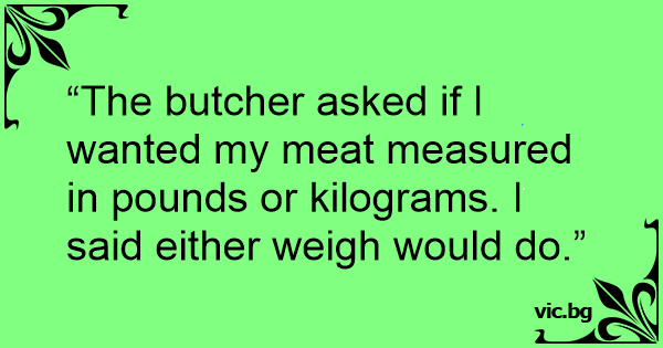 “The butcher asked if I wanted my meat measured in pounds or kilograms. I said either weigh would do.”