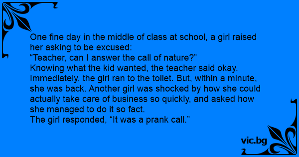 One fine day in the middle of class at school, a girl raised her asking to be excused: “Teacher, can I answer the call of nature?” Knowing what the kid wanted, the teacher said okay. Immediately, the girl ran to the toilet. But, within a minute, she was back. Another girl was shocked by how she could actually take care of business so quickly, and asked how she managed to do it so fact. The girl responded, “It was a prank call.”