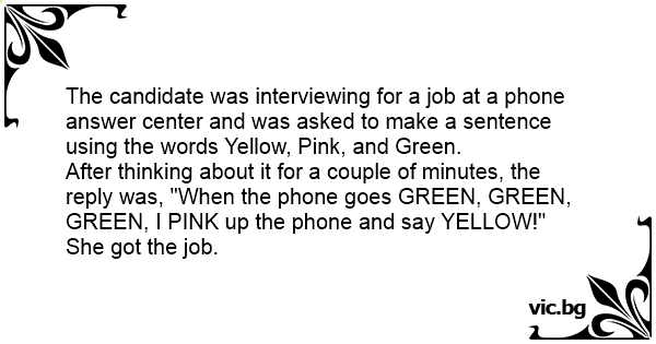 The candidate was interviewing for a job at a phone answer center and was asked to make a sentence using the words Yellow, Pink, and Green.