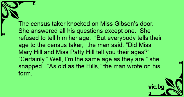 The census taker knocked on Miss Gibson’s door. She answered all his questions except one. She refused to tell him her age. “But everybody tells their age to the census taker,” the man said. “Did Miss Mary Hill and Miss Patty Hill tell you their ages?”
