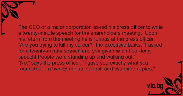 The CEO of a major corporation asked his press officer to write a twenty-minute speech for the shareholders meeting. Upon his return from the meeting he is furious at the press officer.