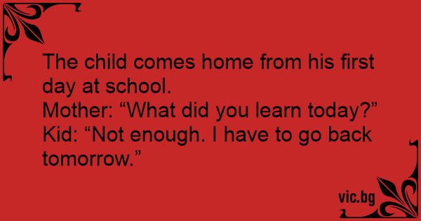 Een kind komt thuis van zijn eerste dag op school. Zijn moeder vraagt: "En, wat heb je vandaag geleerd?" Het kind antwoordt: "Niet genoeg, want ik moet er morgen weer naartoe."